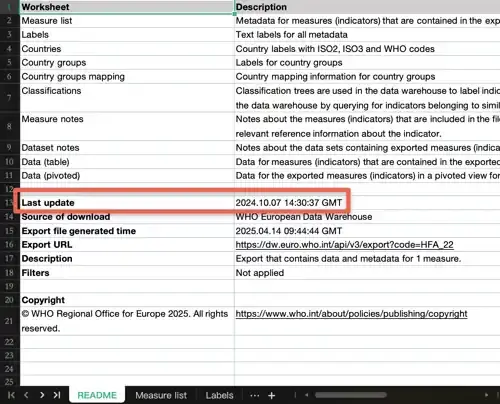 4. Look for the timestamp of the last time this indicator was updated in the Notes worksheet. This means that you can always refer to the Excel file you downloaded for offline analysis, to see how recent the data you are analyzing.