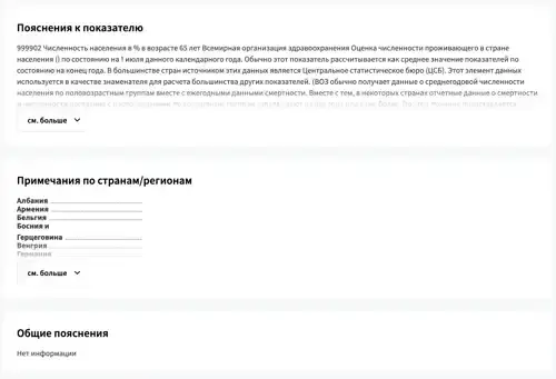 4. На открывшейся странице будут три разворачиваемых раздела. Пояснения к наборам данных содержат сведения, относящиеся ко всем показателям из набора данных, которому принадлежит выбранный показатель. Пояснения к показателю содержат сведения о самом показателе; например, его развернутое определение. Примечания по странам/регионам содержит дополнительную информацию по отдельным странам. Нажмите на стрелочку, чтобы свернуть или развернуть раздел.